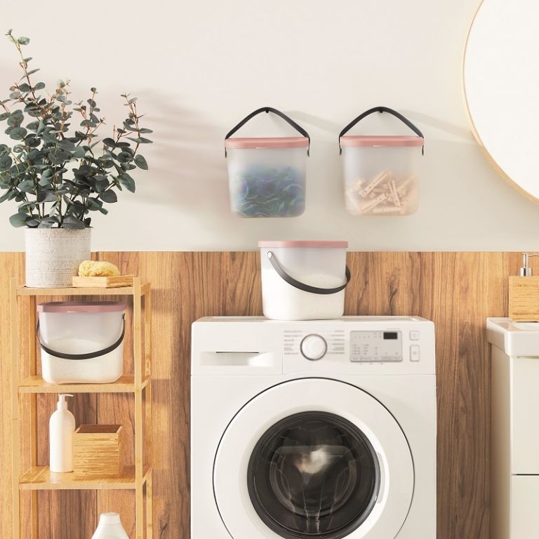A kisebb, fedéllel és fogantyúval ellátott doboz ideális mosópor, mosogatógép-tabletták és egyéb apróságok tárolására.