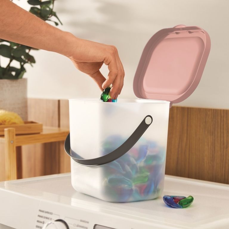 A részletesebb leírás megtekintéseA kisebb, fedéllel és fogantyúval ellátott doboz ideális mosópor, mosogatógép-tabletták és egyéb apróságok tárolására.