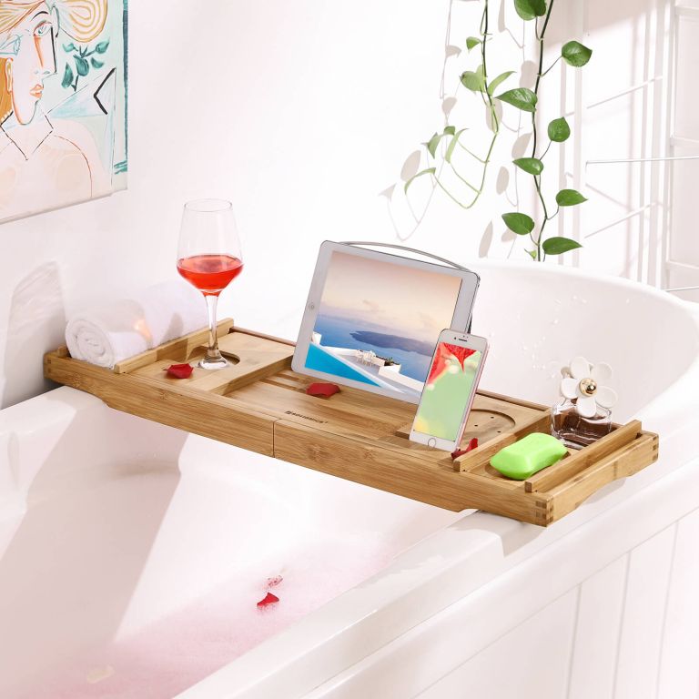 Kényeztesse magát egy luxus fürdővel, bambusz polccal könyvek, bor és gyertyák tárolására – stílusos kiegészítő minden fürdőszobai rituáléhoz.