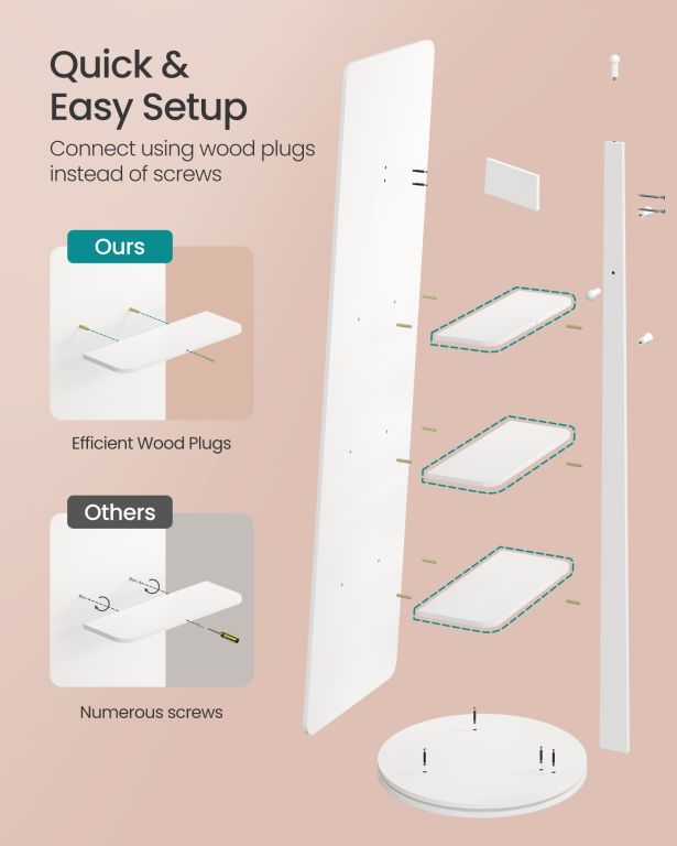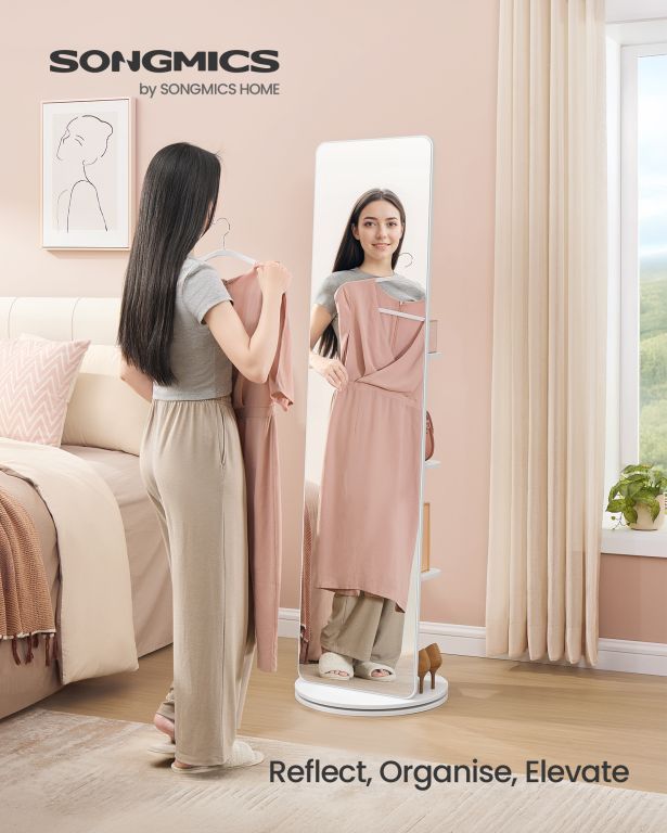 Fedezze fel a stílus és a praktikum kombinációját egyetlen termékben. Ez a magas tükör minimalista dizájnnal és tiszta fehér színnel tökéletesen kiegészíti a hálószobát, az előszobát és a gardróbot. Minden, amire szüksége van, mindig kéznél van a hátulján található 4 polcnak és 4 akasztónak köszönhetően. A forgó mechanizmus lehetővé teszi, hogy könnyen hozzáférjen az összes tárolt tárgyhoz, miközben tökéletes rálátást élvez az egész szettre.
