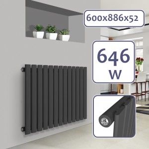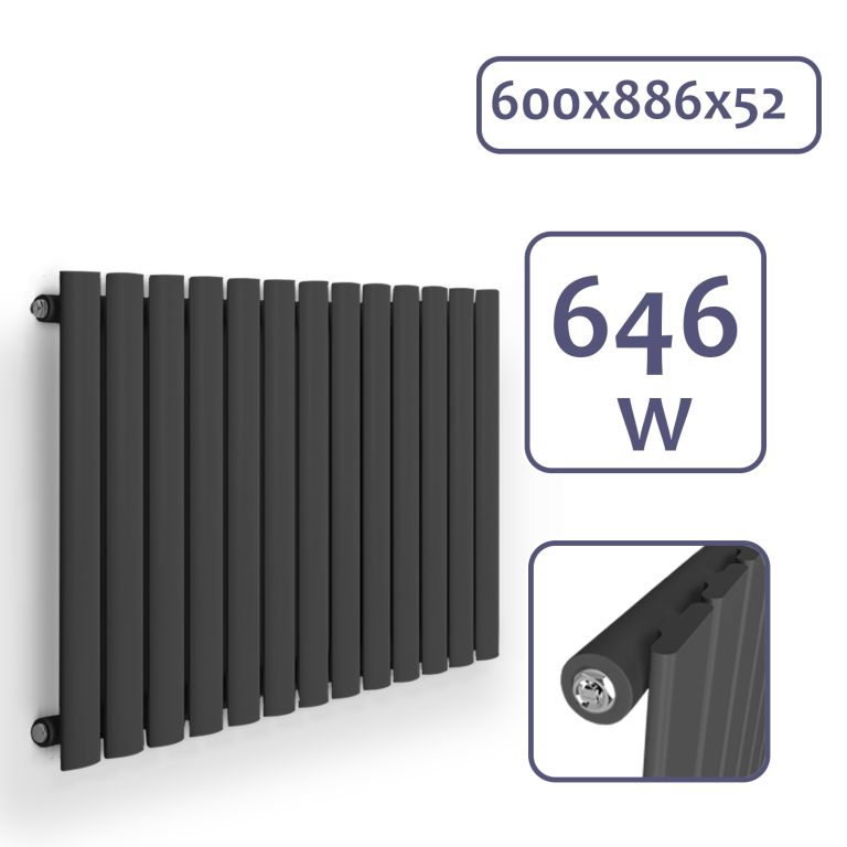Modern, antracit színű panelradiátor, 646 W teljesítmény, 600x886x52 mm méretek. Stílusos és hatékony.