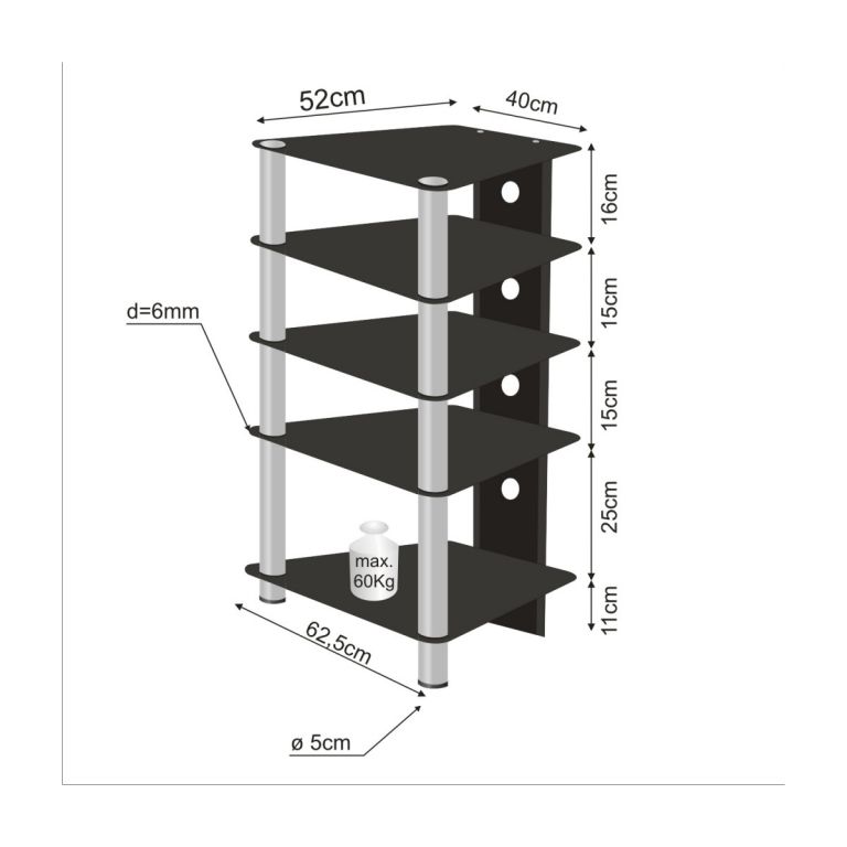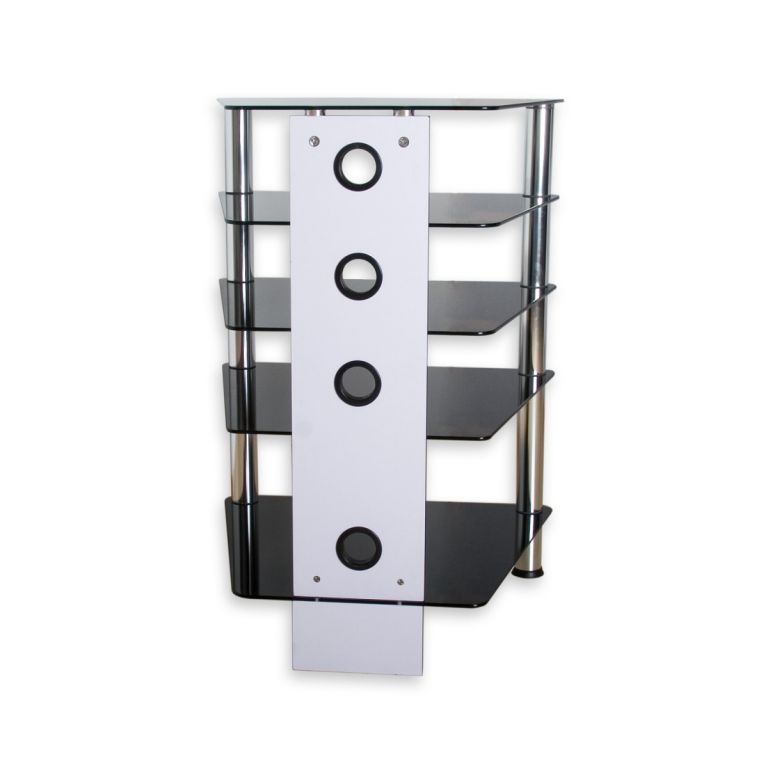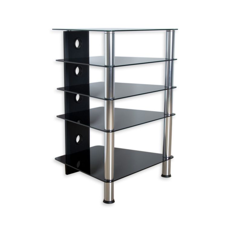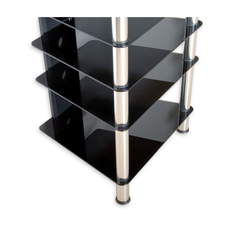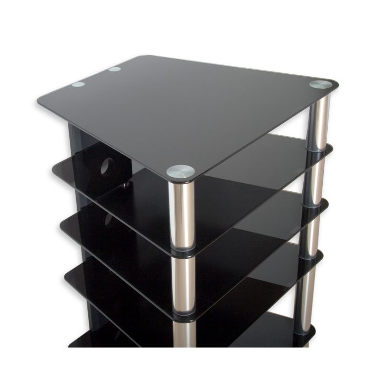 Elegáns egyedülálló dizájnú hifi asztal fekete üveg polcokkal, és alumínium lábakkal.
