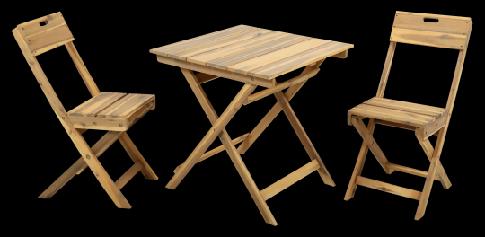 Az akác, mint keményfa hosszú élettartamot és egyben könnyű karbantartást garantál. Két fa szék és egy asztal kényelmes ülőhelyet és egyben nagyon gyors összecsukható és tárolási lehetőséget kínál. A készlet kisebb helyekre is alkalmas.