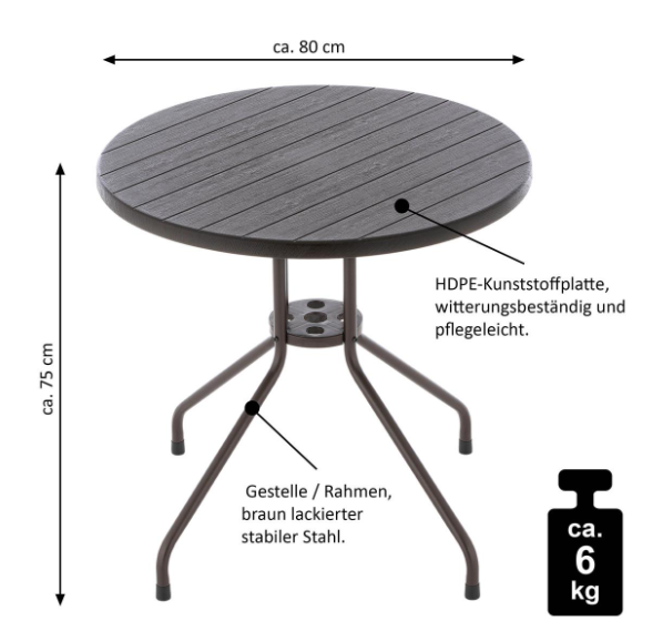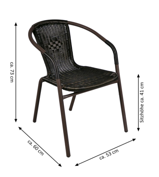 A francia kávézók és bisztrók stílusában berendezett székek könnyű ülőalkalmatosságok erkélyére és kertjébe, teraszára vagy télikertjébe, ízléses bisztróasztallal kiegészítve. Több ilyen típusú széket egymásra is rakhat, így sok helyet megtakaríthat, ha a székgarnitúrát téli hónapokban szeretné tárolni. Természetesen erkélyszékként, kerti székként vagy kempingszékként is használhatja őket, ha szükséges. A székek lábai gumi kiemelkedésekkel/gumi sapkákkal rendelkeznek. Ezek megakadályozzák a csúszást, tompítják a zajt mozgás közben és védik a padlót. A műanyag tetejű, fa kivitelű kerek asztal nagyon stabil és könnyen tisztítható. Az összeszerelés és a szétszerelés magától értetődő. Ez azt jelenti, hogy az erkélyasztal a szezon befejezése után akár kisebb fülkékbe is elrejthető. Jól szolgálhat kerti asztal kiegészítőjeként vagy partikon kisasztalként. Az egymásra rakható szék és a kerti asztal váza porszórt acélból készült, vésett felülettel. A székek sötétbarna polirattanból készülnek, szakadásálló és érdekes szövésű. Minden rattan szék teljes méretei kb. 73 x 53 x 60 cm, súlya kb. 3,5 kg, ülőfelülete pedig kb. 42 x 38 cm. Az asztal átmérője 80 cm, magassága kb. 75 cm. Tekintse meg további praktikus kerti termékeink széles választékát is, mint például összecsukható székek, egymásra rakható székek, kerti padok, napernyők, napernyőállványok, zsámolyok, kerti pavilonok és még sok más.