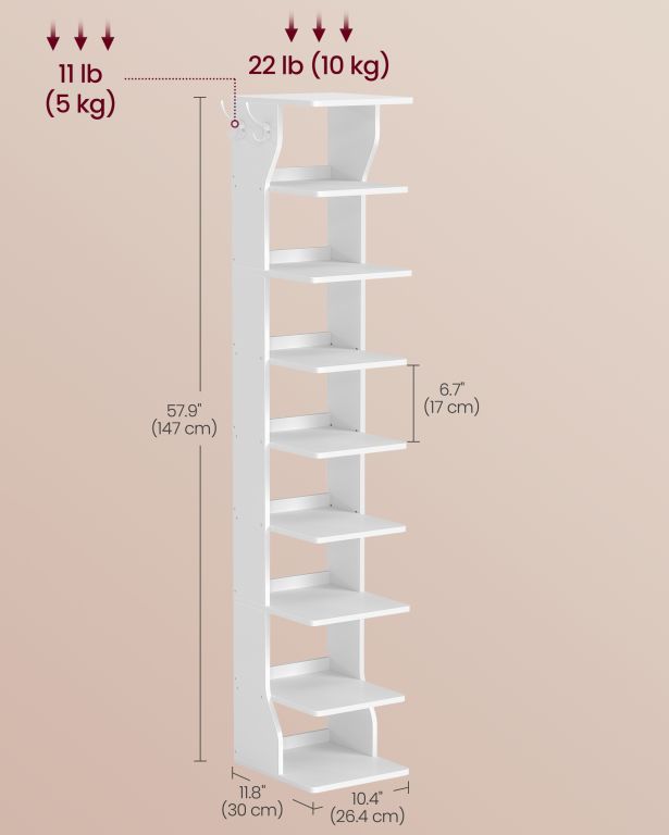 Változtassa át a folyosó káoszát tökéletes renddé ezzel a keskeny, kilenc polcos cipőtartóval. Az elegáns fehér dizájn tökéletesen illeszkedik bármilyen enteriőrbe, a praktikus akasztóknak köszönhetően pedig mindig kéznél lehetnek a kulcsai vagy a kézitáskája.