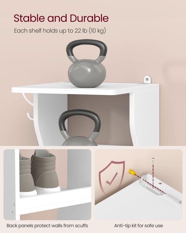 A tartós forgácslap és acél hosszú élettartamot és stabilitást biztosít. Minden polc akár 10 kg-ot, az akasztók akár 5 kg-ot is elbírnak. Az összeszerelés egyszerű, és a mellékelt borulásgátló készletnek köszönhetően a cipőtartó még gyermekes háztartásokban is biztonságos.