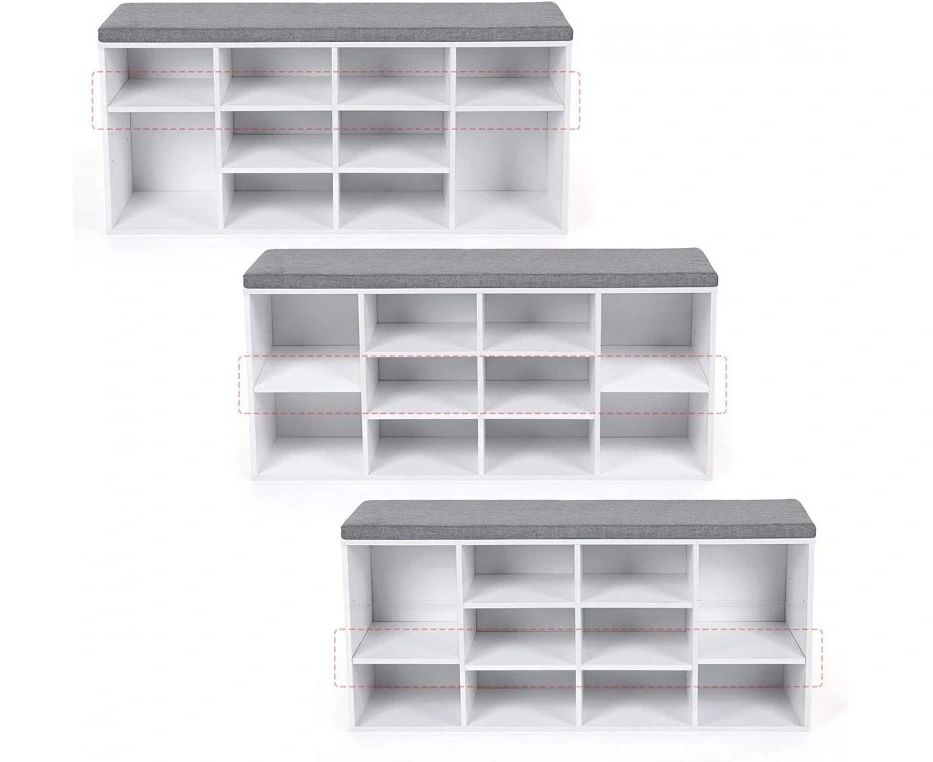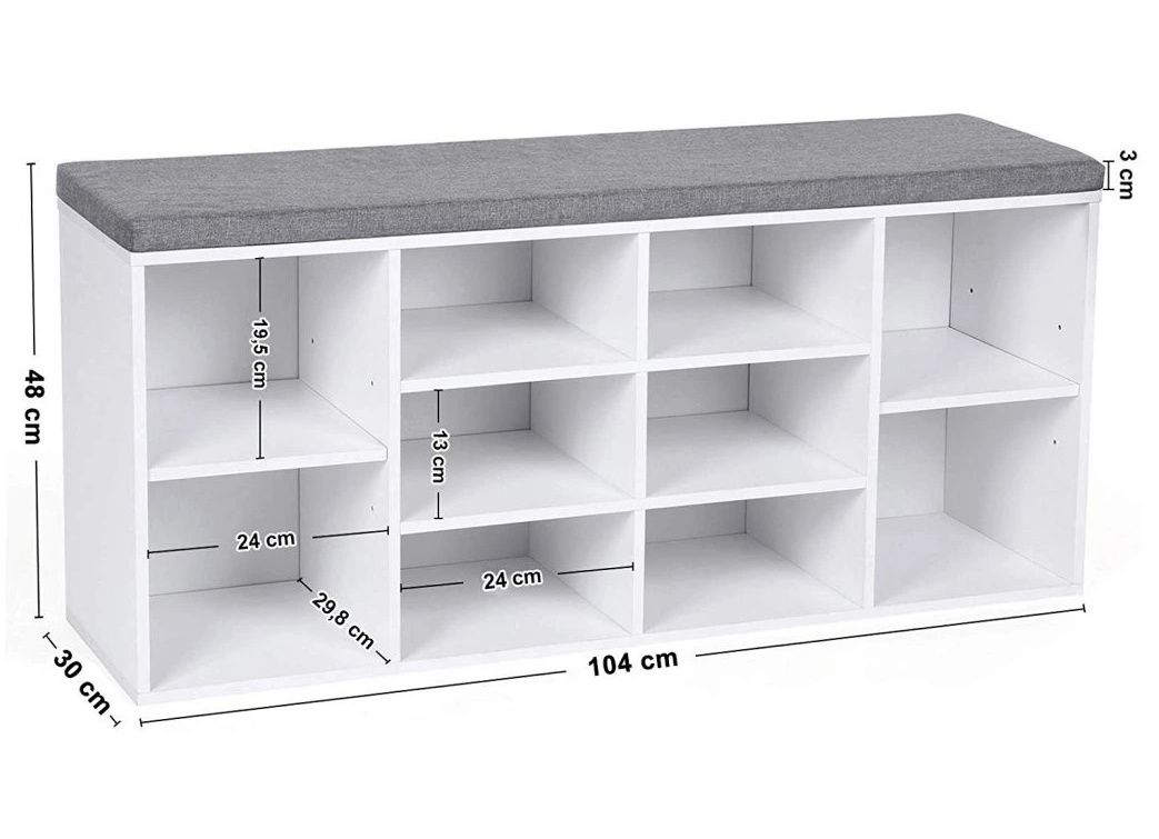 A tíz, 30 cm mély rekesz praktikus elrendezése akár 44-es méretű cipőket is képes befogadni. Az egyes polcok állíthatók, így könnyedén tárolhatja még a magasabb cipőket is. A kiváló minőségű E1 forgácslapból készült masszív szerkezet akár 150 kg-os teherbírásra is alkalmas, így megbízható ülőhelyet és rengeteg tárolóhelyet kap.