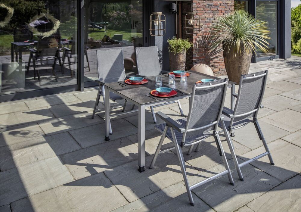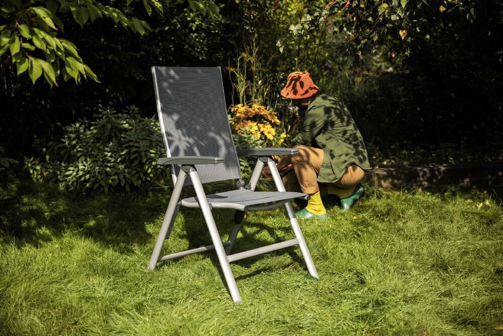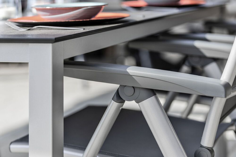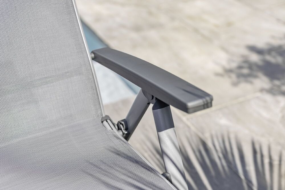 A robusztus, porszórt alumínium váz nagy stabilitást és korrózióállóságot biztosít. A kültéri szövet méretstabil és UV-álló, így a szék még a legnehezebb körülményeket is ellenáll. Az ergonomikus karfák és a 150 kg-os teherbírás garantálja a kényelmet és a hosszú élettartamot. A karbantartás egyszerű, a szerkezet könnyű és tárolható.