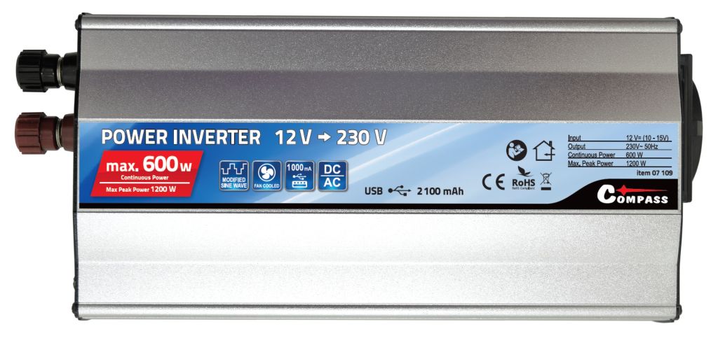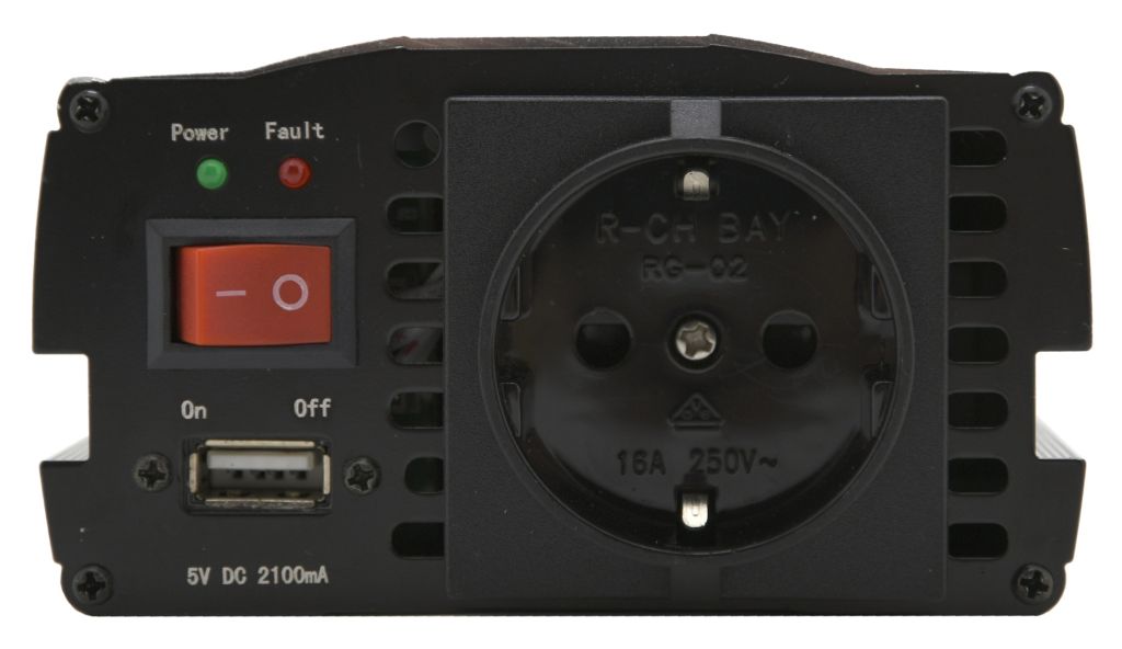 Nagy teljesítményű inverter, univerzális használatra, amikor 230V/50Hz-es hálózati készülékek csatlakoztatása szükséges 12 V= elosztású helyeken. A tápfeszültség bekötése 70cm-es kábelekkel van megoldva, a 12V-os akkuhoz kapcsokkal. Az átalakító kimenete egy közös 230 V-os európai típusú aljzattal van ellátva a földelő érintkező nélküli készülékekhez, azaz "kéttűs" csatlakozóval. Ezen kívül van egy USB-aljzat, amely alkalmas MP3-lejátszókhoz, mobiltelefonokhoz és egyéb olyan eszközökhöz, amelyeket normál USB 5V-os forrásból töltenek vagy táplálnak 2100 mA-ig. Továbbá az inverter fel van szerelve kapcsolóval, működésjelzőkkel és a nemkívánatos állapotok jelzésével.