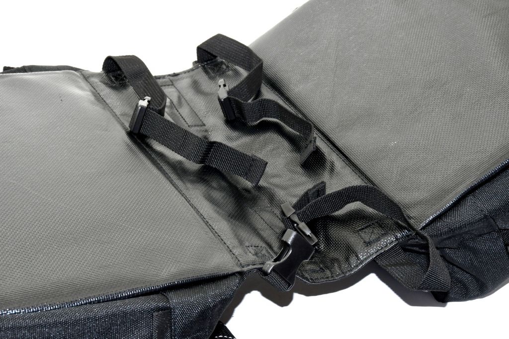 A táska elülső részét és a felső táskát további hálós zsebek egészítik ki. A zsebek, kivéve a hálót, cipzárral vannak felszerelve. Ennek a kerékpáros táskának köszönhetően nagy mennyiségű rakományt lehet szállítani, például vásárlást, amely egyébként nem vezethető biztonságosan kerékpáron. Az alsó rész állítható csatokkal van felszerelve, a könnyű rögzítéshez a különböző méretű hordozókhoz. A felhasznált anyagnak köszönhetően, különösen belülről, a táska robusztus és könnyen mosható.
