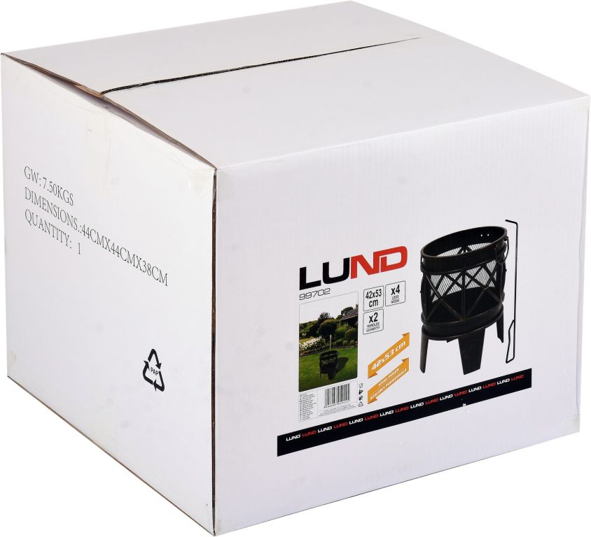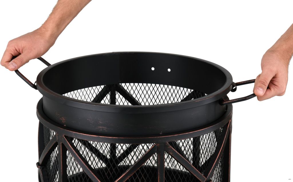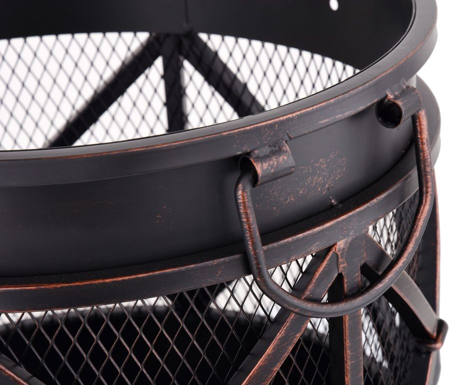 Ideális a biztonságos tábortűz készítéséhez hő- és fényforrásként, valamint dekorációs elemként is. A zománcozott felületű acéltest biztosítja a tűzrakóhely nagy tartósságát. A magas hálós falak biztosítják, hogy a fa és a hamu ne hulljon a tűzrakóhely köré. Az acéllábak biztosítják az alap stabilitását és hővédelmét. A modern kialakítású testet két fogantyú is kiegészíti a hordozhatóság érdekében.