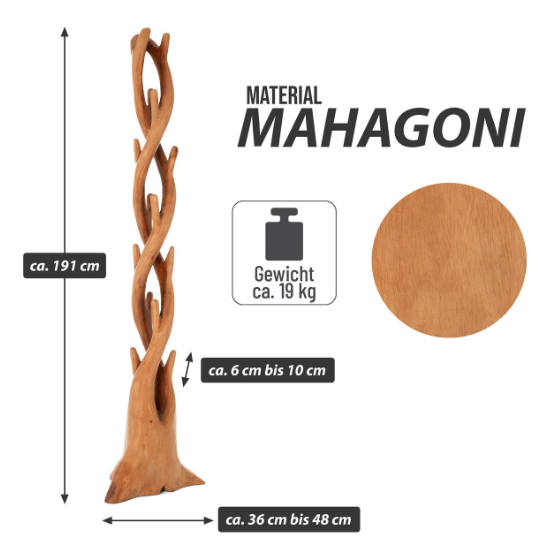 Minden darab természetesen termesztett, ezért egyedi. A pontos forma, mintázat, szín és a kampók száma kissé eltérhet. Ez a dizájner bútor teljesen kézzel készült. A végső forma kialakításához számos faragási, csiszolási és lakkozási lépés szükséges. A szokatlan kialakítású szúrós kialakítás minden belső tér dísze, és ez a fogas valódi figyelemfelkeltő elem lesz az előszobában, folyosón, váróteremben, ügyvédi irodában, ügynökségben, orvosi rendelőben vagy irodában. Súlya és széles alapja biztosítja a stabilitást. A mahagóni/keményfa lakkozott, így a kabátfogas különösen könnyen karbantartható és enyhén nedves ruhával tisztítható. Kínálatunkban további illeszkedő fa bútorok, például asztalok és székek is megtalálhatók. Figyelem: Ez egy természetes termék. A finom repedések és a fokozatos színváltozások a keményfa természetes tulajdonságai, amelyek hozzájárulnak annak egyedi varázsához és karakteréhez. Termékeink gyakorlatilag elpusztíthatatlanok, és kizárólag fenntartható módon kitermelt fából készülnek.