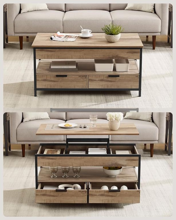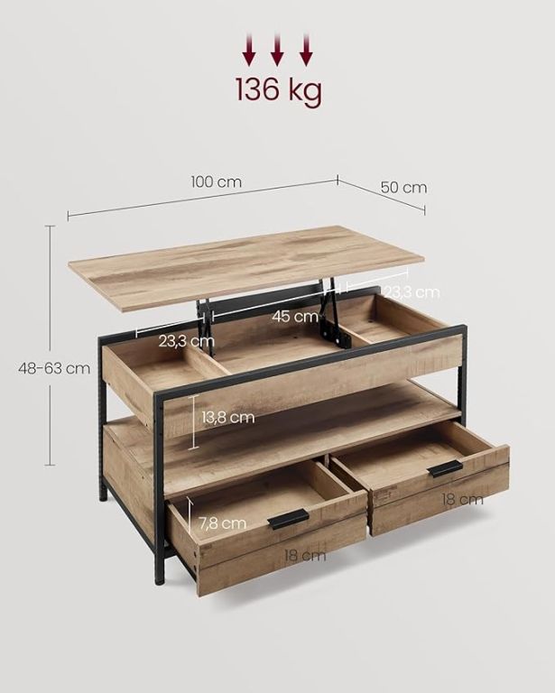 Az asztal tartós forgácslapból és acélvázból készült, amely hosszú élettartamot és stabilitást biztosít. A kiváló minőségű fém zsanérok lehetővé teszik az akár 20 kg-ot is elbíró asztallap sima emelését. A praktikus tárolóhelyek, beleértve a rejtett rekeszeket és fiókokat, mindent kéznél és szem elől elrejtve tartanak, amire szüksége van.