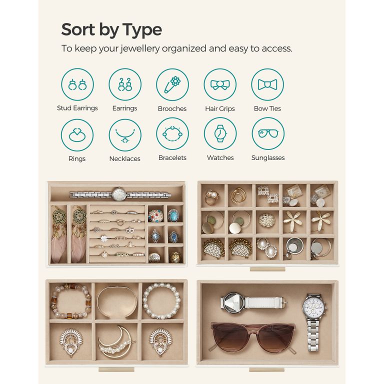Erős MDF alap, minőségi PU bőr borítás és négy tágas fiók biztosítja a praktikus elrendezést. Bársony bélés óvja az ékszereket a karcolásoktól, a tisztítás pedig egyszerű és gyors.