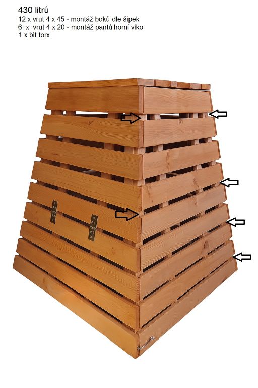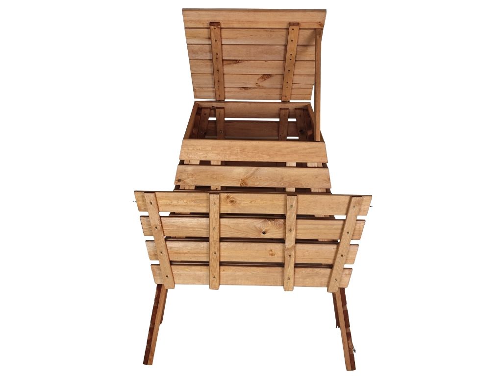 Masszív szerkezetű, természetes olajjal kezelt luc- vagy fenyőfából készült, 430 literes térfogattal. Praktikus fedéllel és nyitható előlappal ellátva a könnyű kezelhetőségért és komposzt kivételért. Egyszerűen összeszerelhető, hosszú távú használatra tervezve.