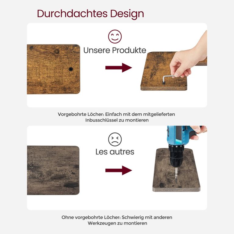 A szerelés egyszerű és gyors az előre elkészített paneleknek és a világos útmutatónak köszönhetően. Minden polc 5 kg-ig terhelhető, és a kábeltároló helynek köszönhetően otthonod mindig rendezett lesz. A kiváló minőségű forgácslap és acél hosszú élettartamot és könnyű karbantartást garantál.