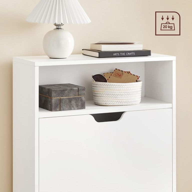 Fedezze fel a letisztult design és a rendezett elrendezés varázsát ezzel a fehér cipőtartóval. Cipői mindig tökéletes rendben lesznek, előszobája pedig friss, modern megjelenést kap. A praktikus felső polc és a nyitott rekesz ideális kulcsok, pénztárca vagy szemüveg tárolására – így minden kéznél van, amikor elindul otthonról.
