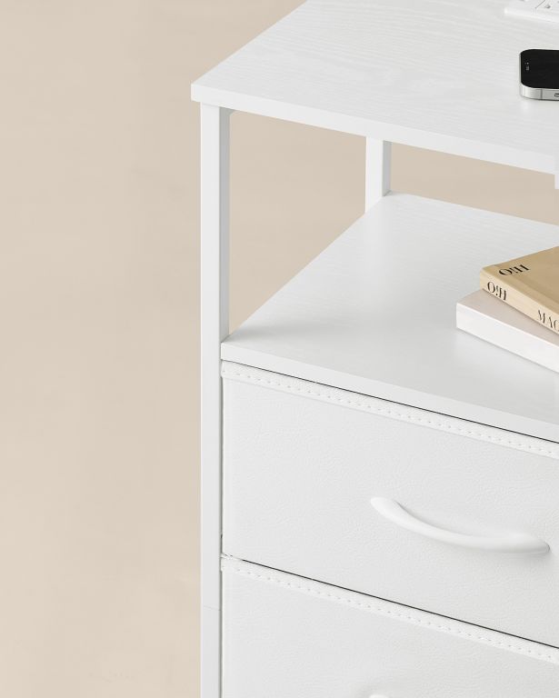Az asztal tartós acélból, MDF-ből és farostlemezből készült, ami garantálja a stabilitást és a tartósságot. Könnyű összeszerelés a mellékelt utasításoknak köszönhetően. Két fiók és egy nyitott polc rengeteg helyet biztosít mindennek, amire szükséged van. A karbantartás egyszerű, csak töröld át egy nedves ruhával.