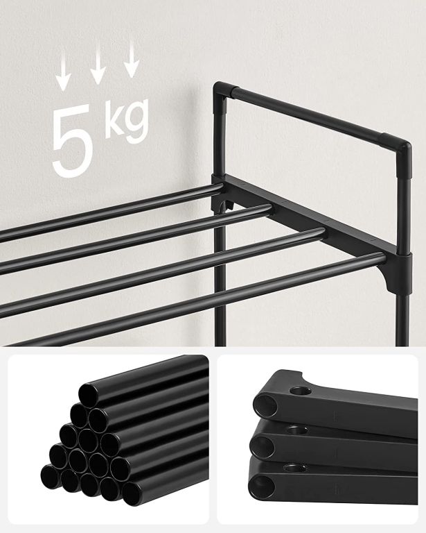 Vigyen rendet és stílust otthonába ezzel a tágas cipőtartóval, amely akár 15 pár női vagy 12 pár férfi cipőt is képes tárolni. Az elegáns fekete dizájn bármilyen előszobába, hálószobába vagy öltözőbe illik, és segít abban, hogy cipői rendezetten és mindig kéznél legyenek.