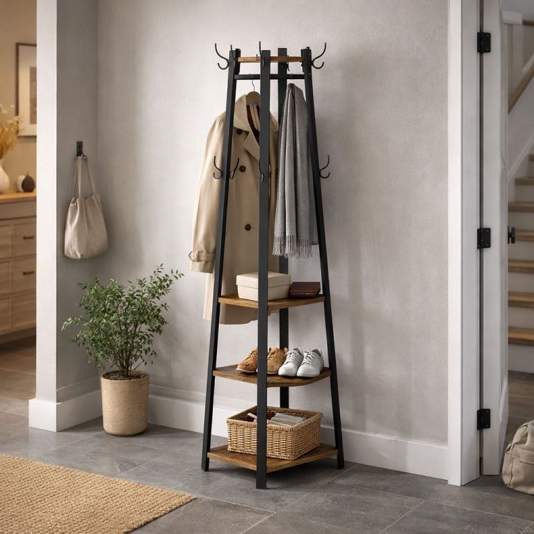 Egy stílusos, polcokkal és akasztókkal ellátott, ipari formatervezésű állvány helyet takarít meg, és rendet, eleganciát visz minden előszobába.