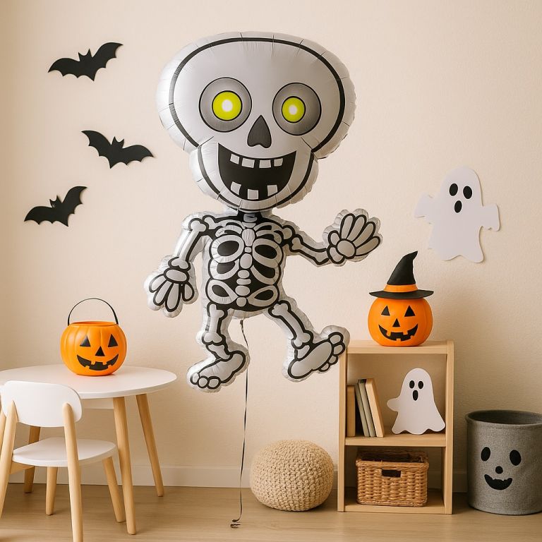 A csontváz hélium ballon sikeres Halloween dekoráció. Teljesen mindegy, hogy ijesztő, vicces vagy fura pár egymáshoz passzoló, mottóval ellátott lufi megfelelő hangulatot varázsol.