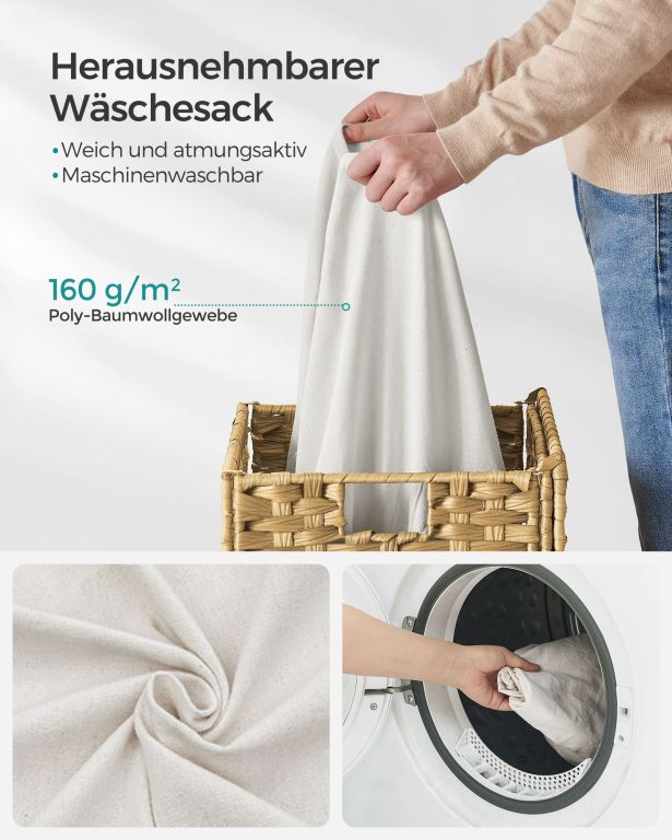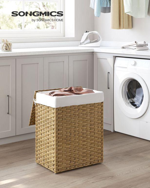 A műrattanból és fémvázból készült tartós szerkezet hosszú élettartamot biztosít még nedves környezetben is. A kivehető pamutbetét megkönnyíti a szennyes szállítását, míg a szilikon lábak védik a padlót. A szerelés gyors, és a kosár helytakarékos módon összecsukható.