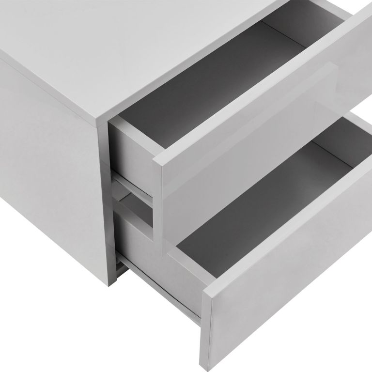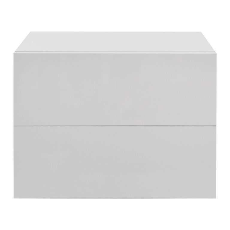 Modern, függesztett éjjeliszekrény két fiókkal, fehér színben, ideális helytakarékosságra.