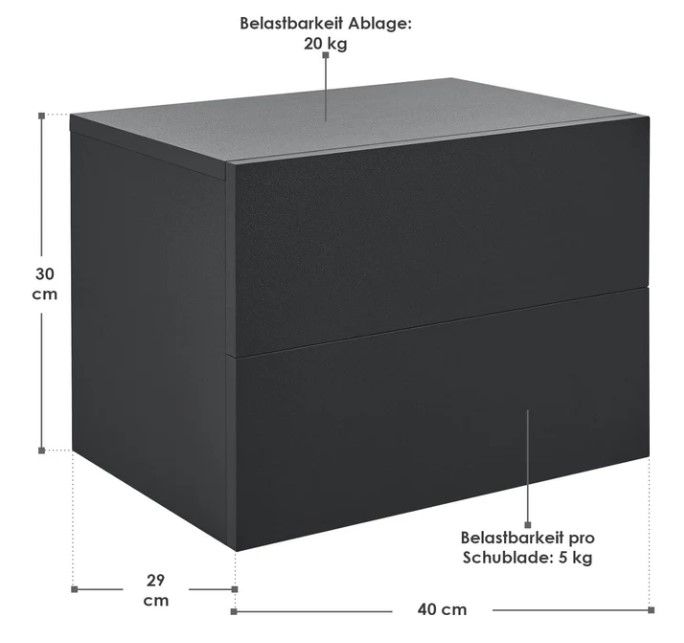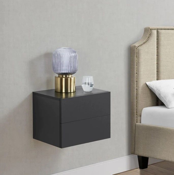 Vigyen modern eleganciát otthonába ezzel a fekete színű, függesztett éjjeliszekrénnyel. Két tágas fiókja lehetővé teszi, hogy mindig kéznél legyen minden, amire szüksége van, akár az ágy mellett, a nappaliban vagy a folyosón. A minimalista dizájn bármilyen enteriőrbe illeszkedik, és helyet biztosít dekorációknak, könyveknek vagy egy lámpának.
