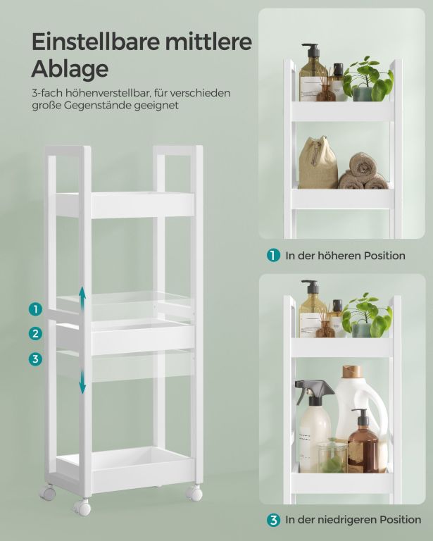 Praktikus, keskeny, kerekes polc fürdőszobába vagy konyhába, könnyen mozgatható és minden sarkot ki tud használni.