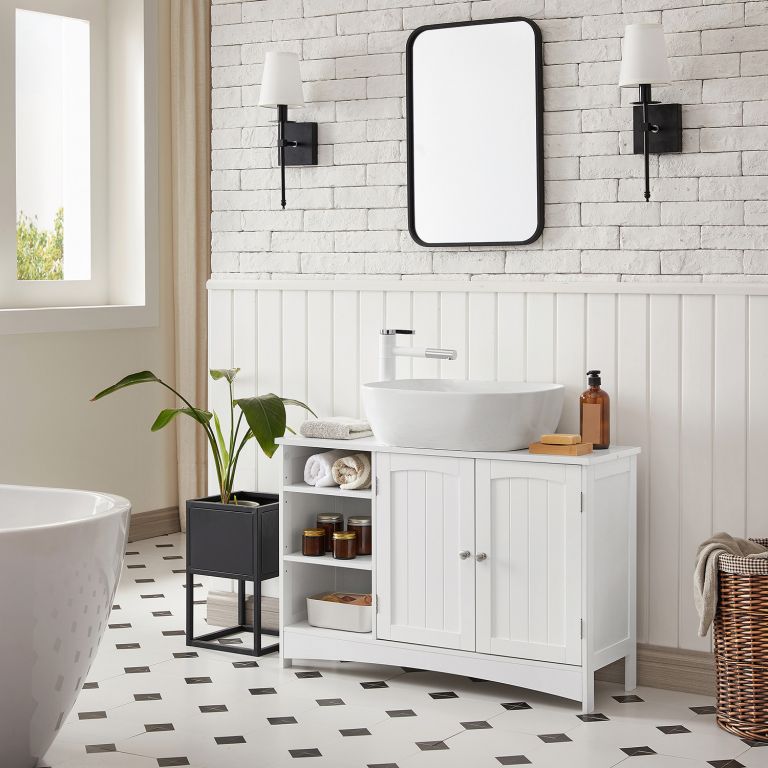 Stílusos fehér fürdőszobai szekrény mosdó alá, krómozott fogantyúkkal és állítható polcokkal.