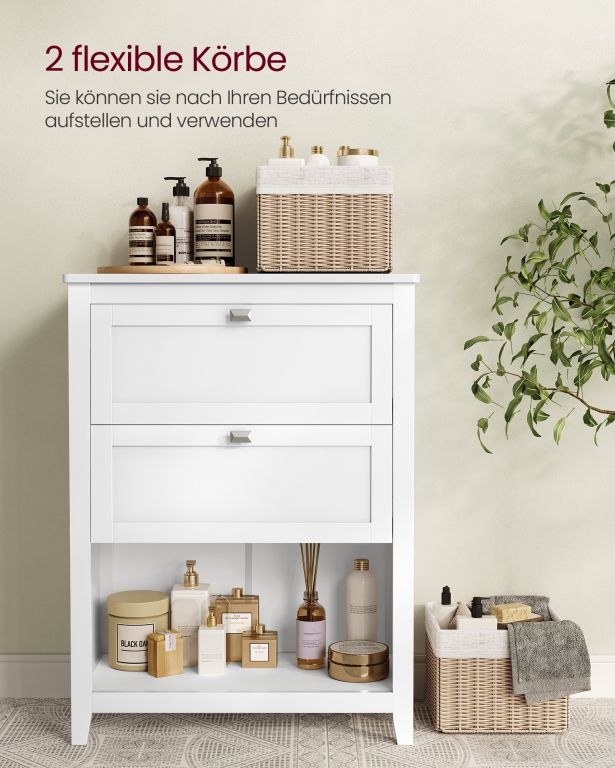 Vigyen friss eleganciát és rendet fürdőszobájába ezzel a stílusos, fehér felhőszerű szekrénnyel. Két tágas fiók, egy nyitott rekesz és két műrattan kosár lehetővé teszi, hogy mindig kéznél legyen minden, amire szüksége van. A szekrény nemcsak a fürdőszobába, hanem a folyosóra vagy a hálószobába is ideális egyszóval, bárhová, ahol több tárolóhelyre van szüksége.