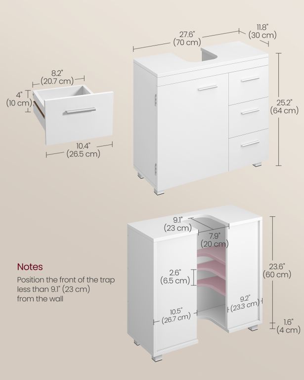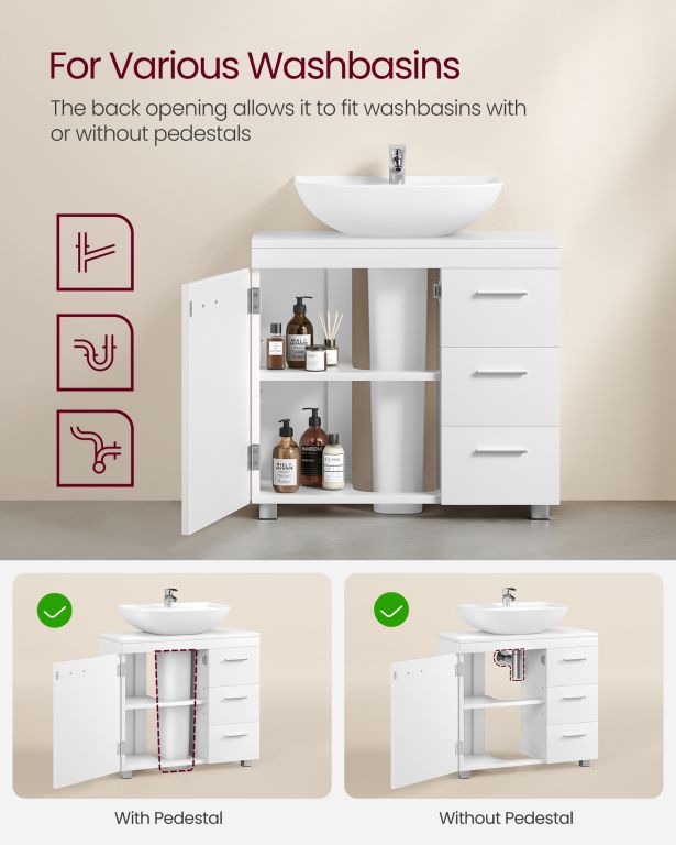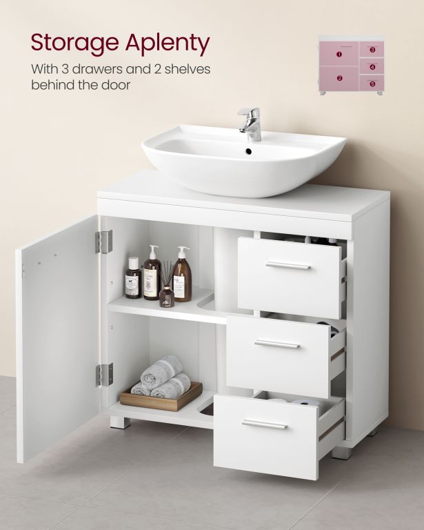 Élvezze a rendezett és harmonikus fürdőszobát minden nap. Ez a fehér mosdószekrény rengeteg helyet kínál minden igényére. Három fiók és két rekesz az ajtó mögött lehetővé teszi a törölközők, kozmetikumok és tisztítószerek egyszerű rendszerezését. Az elegáns dizájn tökéletesen kiegészít bármilyen belső teret, és tisztaságot és frissességet kölcsönöz a fürdőszobának.