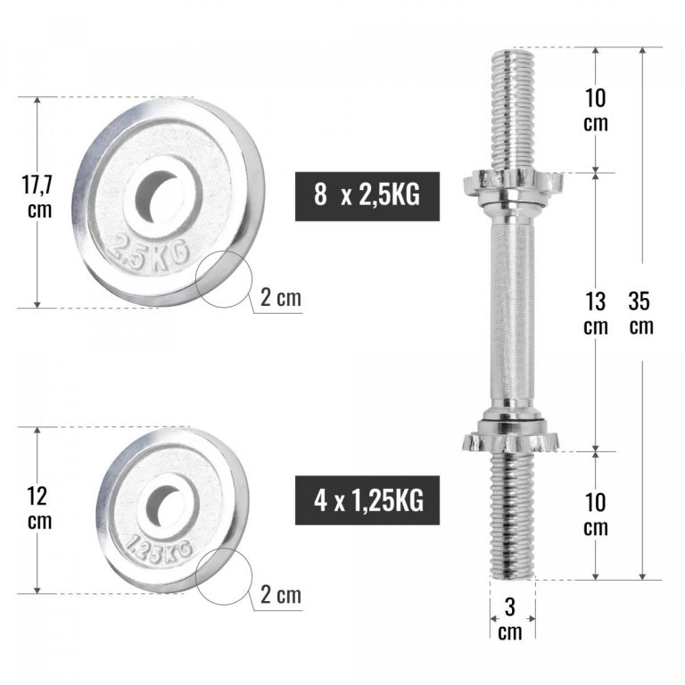 Két súlyzóból áll. Különböző súlyú, praktikus csillagzárakkal rendelkező, megfelelő teherlemezek kaphatók. A súlyzó fogantyúi a jobb tapadás érdekében bordázottak. Ezzel a készlettel megerősítheti karjait, törzsét és egyenletes lábait guggolás és hasonló súlygyakorlatok végrehajtása során. Használja a súlyzókat a nyak vagy az alkar kis izmainak bevonására is. A 30 kg-os krómozott súlyzók nagyszerű megjelenéssel hatnak. Az ezüst fényű nagyon elegánsnak tűnik, és tökéletesen illeszkedik a modern edzőberendezésekhez és bútorokhoz.
