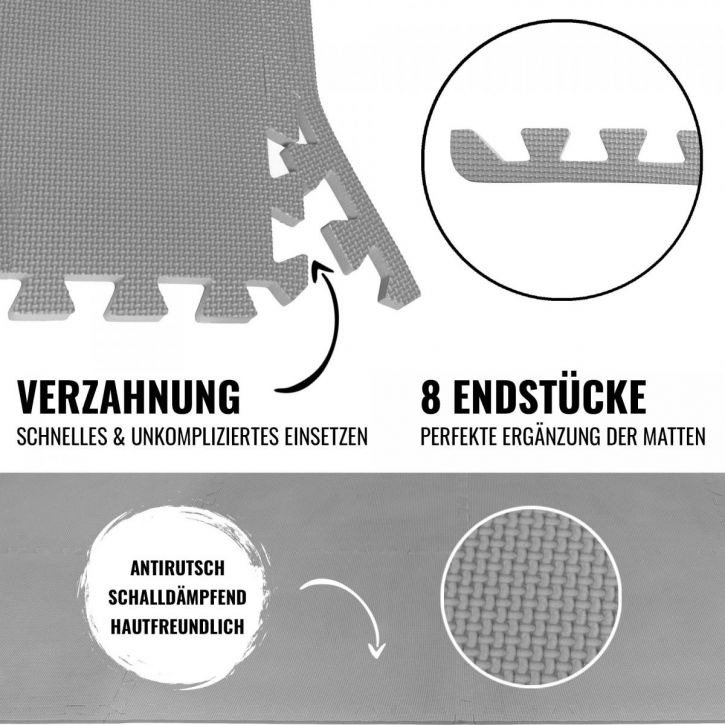 A végek kiváló minőségű bőrbarát habból készültek. Törölhetőek és könnyen tisztíthatók. A védőszőnyegekhez hasonlóan a végsapkák is kopásállóak és csúszásmentesek, így Önnek és berendezésének szilárd alapot biztosítanak. Megvédik a padlót, felmelegítenek, ha a felület hideg, és tompítják az edzés közben fellépő zajt.