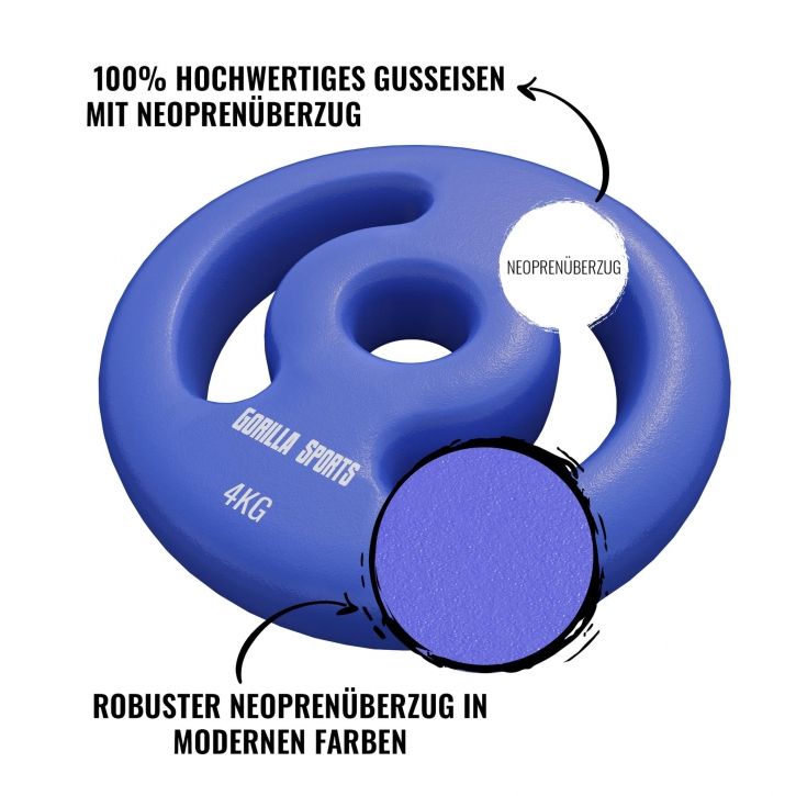 Egyszerűen építse fel saját edzésterhelését. Nem számít, hogy kezdőként kezded, vagy már nagy tapasztalattal rendelkezel a megfelelő képzésben. Köszönhetően annak, hogy az egyes súlytárcsák első látásra megkülönböztethetők egymástól a különböző színükkel, rendkívül nagy kényelem áll rendelkezésére, és nem kell sokáig keresnie a megfeleleő súlytárcsát, mielőtt folytathatja edzését. Ezenkívül a neoprén felület viszonylag könnyen tisztítható. Egy vízzel megnedvesített kendő gyakran elegendő az izzadságmaradványok és hasonló szennyeződések gyengéd eltávolításához.
