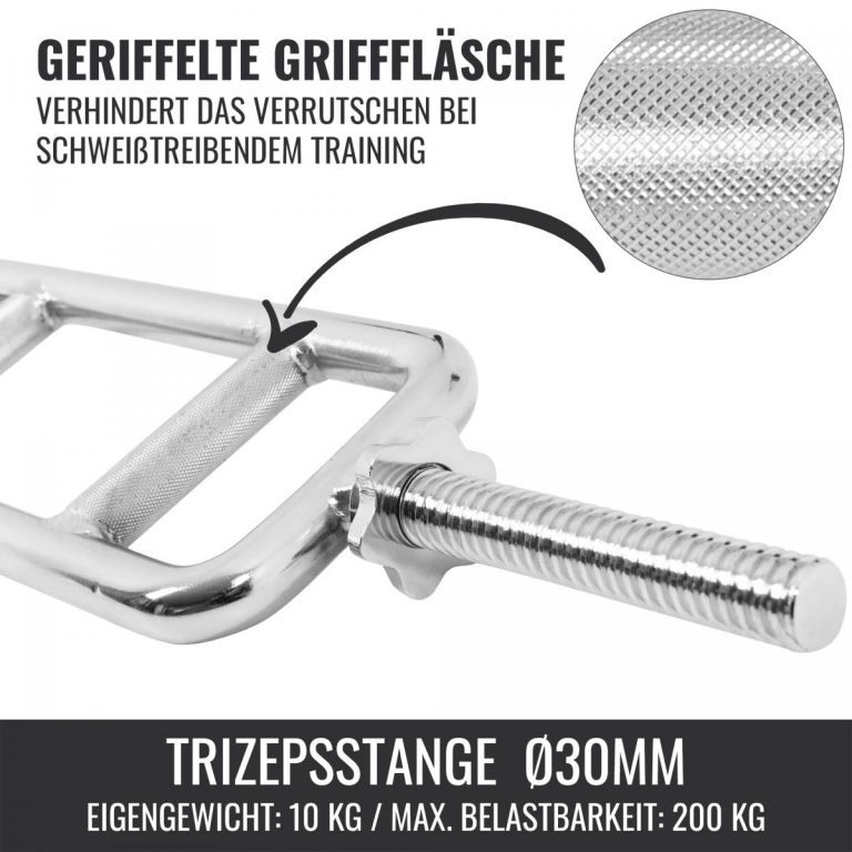 A Gorilla Sports univerzális rúdja ideális felszerelés a célzott tricepsz edzéshez. Párhuzamos fogantyúi természetes kéztartást tesznek lehetővé, amely kíméletes az ízületekhez. A fogantyú recézettsége minden körülmények között biztos fogást biztosít. A mellékelt zárak szilárdan a helyükön tartják a súlyokat.