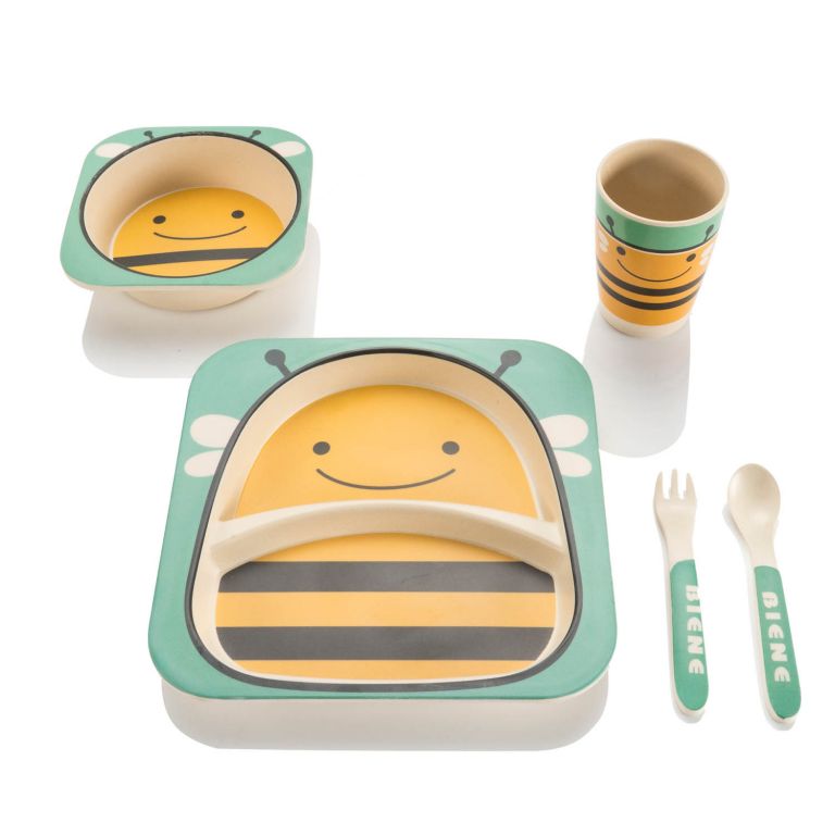 A részletesebb leírás megtekintéseMindegyik készletben talál egy gyerek tányért, egy leveses tálat, egy csészét, egy villát és egy kanalat.