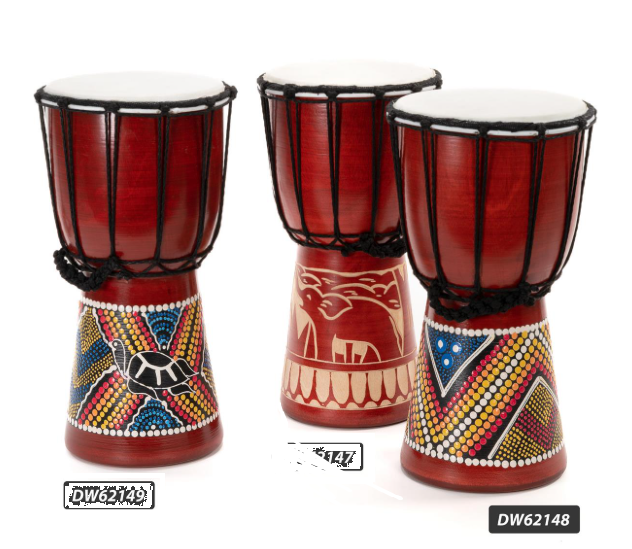 Kis mahagóniból és kecskebőrből készült djembe, ideális gyerekeknek és utazáshoz. Kézzel festett, minden darab eredeti.
