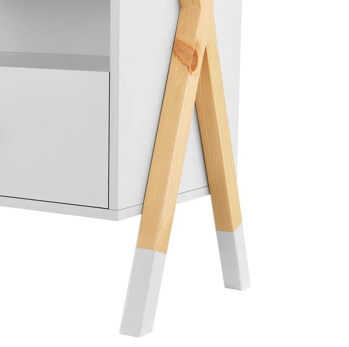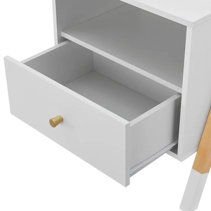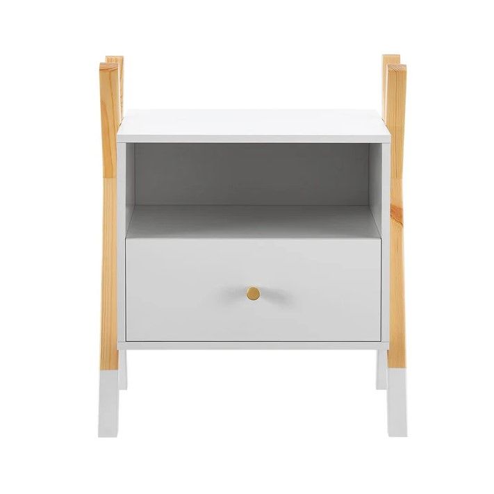 Az asztal MDF-ből és fenyőfából készült, ami stabilitást és hosszú élettartamot biztosít. Könnyen karbantartható - csak nedves ruhával törölje át a felületet. A fiók, a nyitott polc és a felső felület elegendő helyet kínál egy lámpának, könyveknek vagy egy ébresztőórának.