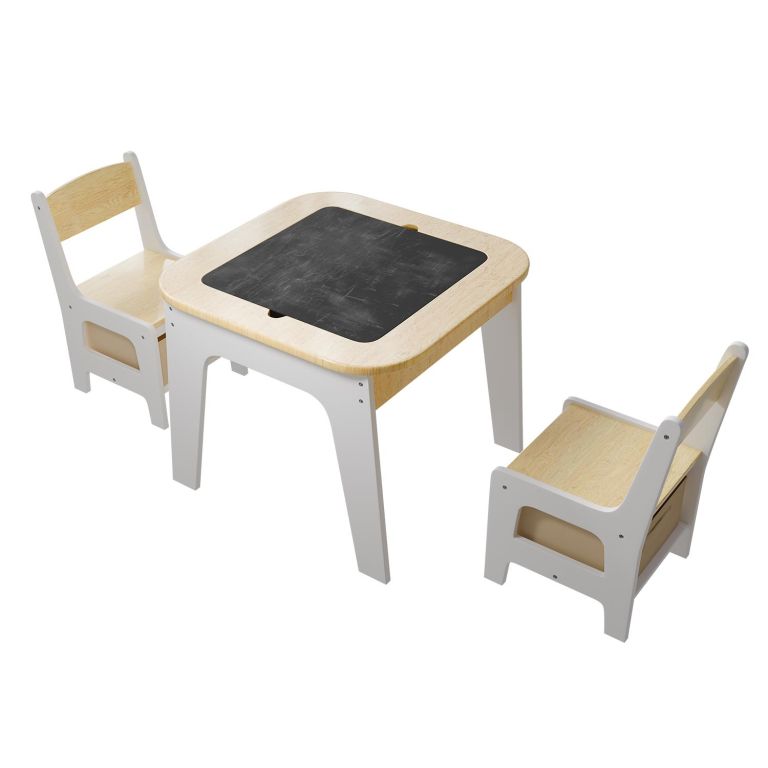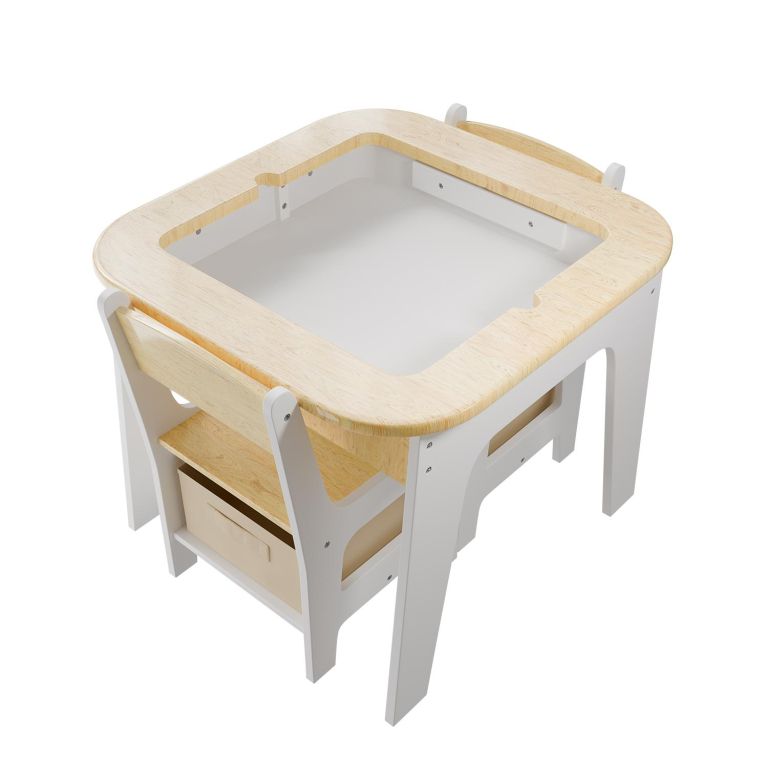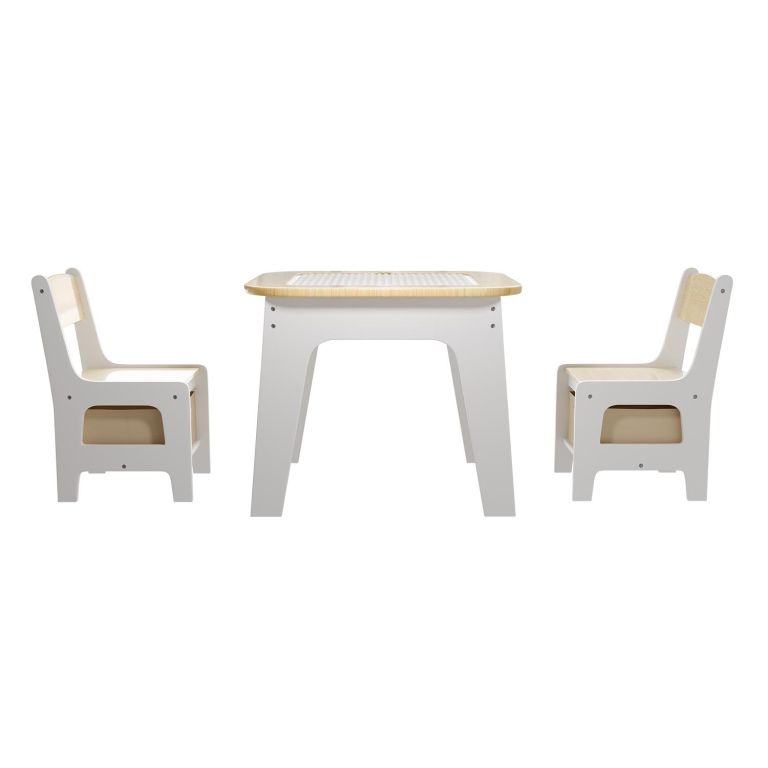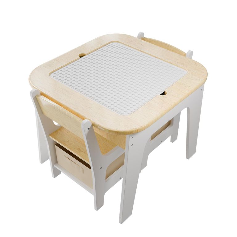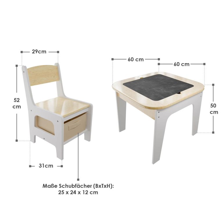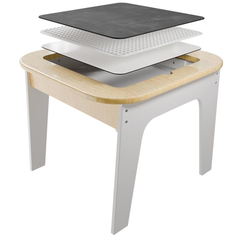 Masszív, természetes fából készült szerkezet garantálja a hosszú élettartamot és a biztonságot. A cserélhető asztallapok többféle játék- és tanulási lehetőséget kínálnak – rajzolás, építőkockázás vagy írás. Az egyszerű karbantartás és gyors összeszerelés minden szülő számára előny.