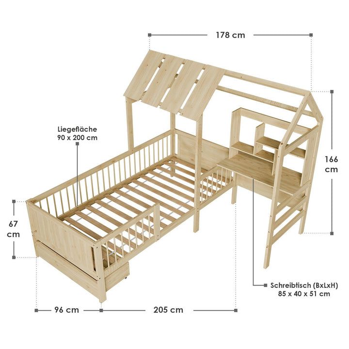 A természetes gyerekágy minden gyermeket és szülőt elbűvöl eredeti, házikószerű megjelenésével. Biztonságos és inspiráló helyet teremt a játékhoz, a pihenéshez és a tanuláshoz. A praktikus fiókok és az íróasztal lehetővé teszik, hogy a gyerekek minden szükséges dolog kéznél legyen, miközben a szoba is rendben marad.