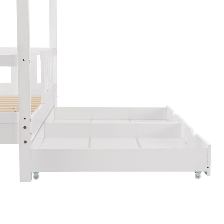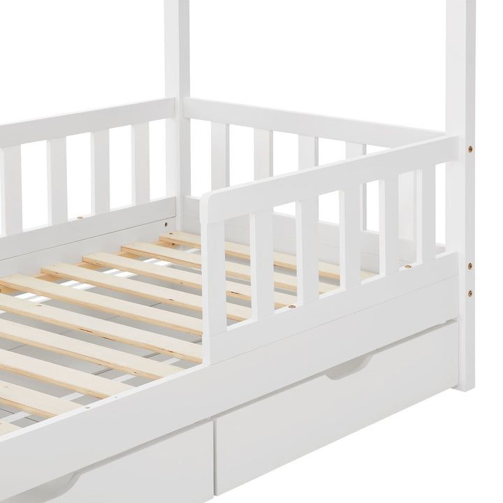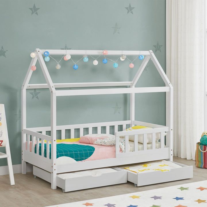 Stílusos gyerekágy-ház 80x160 cm-es fiókokkal, elválasztó résszel és rácsos ággyal. Biztonság, játékosság és tárolóhely egyben.