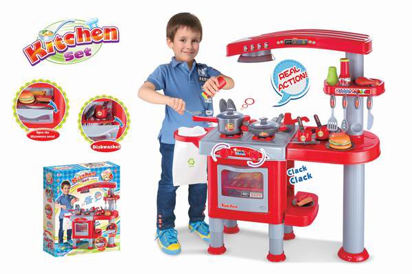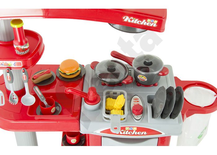 Gyermek konyha edényekkel, konyhapulttal és gőzelszívóval. Ez a gazdagon felszerelt konyha megfelelő ajándék minden kis kukta számára. A konyha tartozékai közé tartozik a sütő, a mosogató, a szemétkosár és más egyéb kellékek.