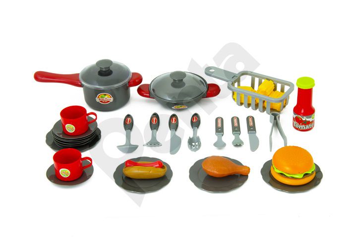 A készlet tartalma: 1x összecsukható konyha gőzelszívóval 1x kifordítható szemetes láda 1x csap 1x fazék fedővel 1x lábas fedővel 2x bögre 2x teáskanál 1x merőkanál 1x húslapát 1x BBQ fogólapát 1x spagetti kiszedő kanál 1x Evőeszközkészlet 4x nagy tányér 6x kistányér 1x fritőzbe való kosár 1x kés 1x fűszertartó 1x sótartó Étel 3 adag sült krumpli 1 hotdog 1 hamburger 1 csirke comb Matricák a konyhába