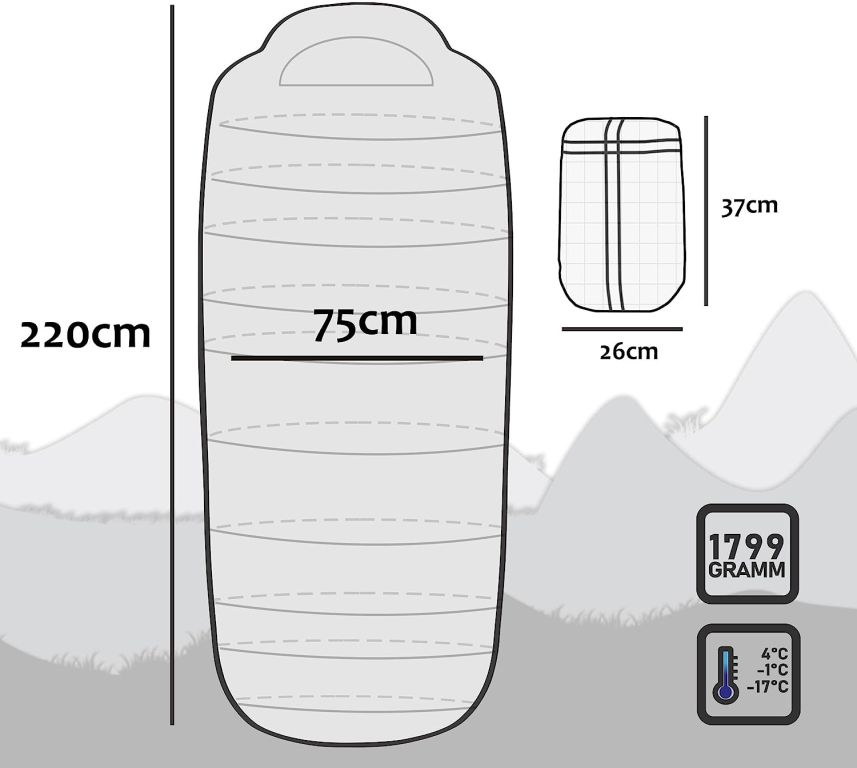 A tartós poliészter anyag vízálló, szélálló és szivárgásmentes. A hálózsák kétirányú cipzárral, beépített értéktárgyzsebbel és kompressziós zsákkal van felszerelve a könnyű csomagolás érdekében. Akár -17 °C-os hőmérsékletig alkalmas, könnyen karbantartható, és kiváló minőségű kidolgozásának köszönhetően még a legzordabb körülményeket is ellenállja.