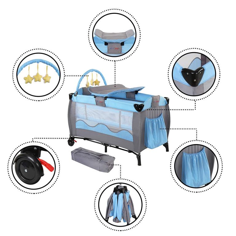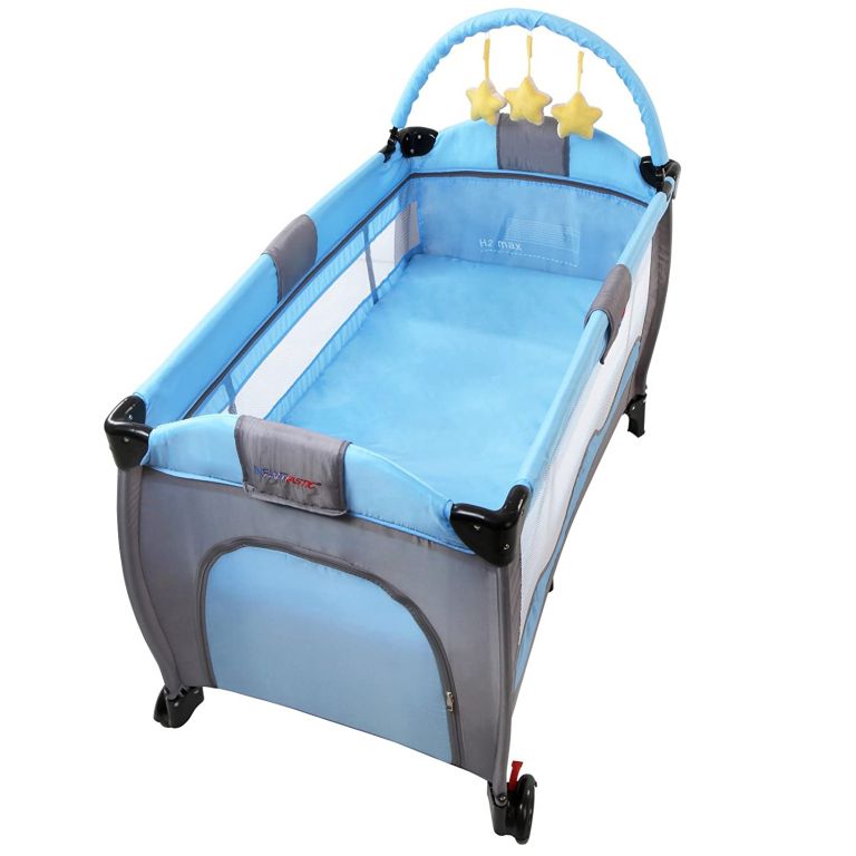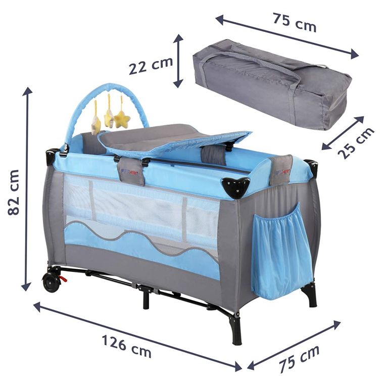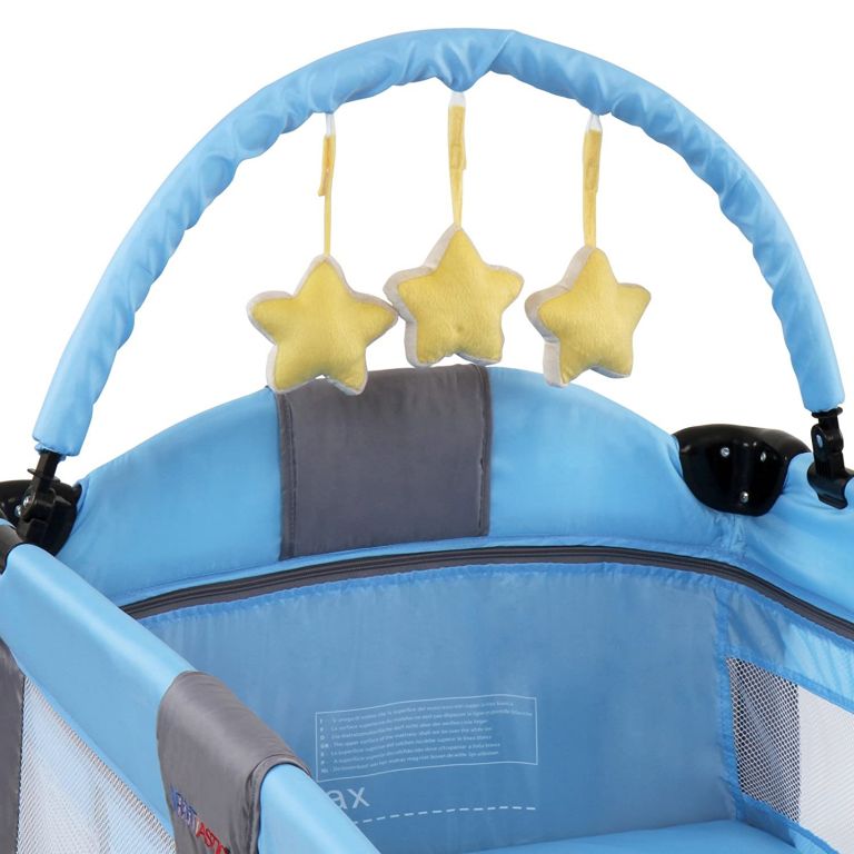 Ez a gyerekágy nagyon praktikus. Ívet és pelenkát kínál babáknak. A matrac párnázott. A játék íve lóg plüss csillagokkal. Alkalmas gyermekeknek 36 hónapos korig, vagy kb. 15 kg súlyig. A gyermekágy könnyen összecsukható és gazdaságosan tárolható