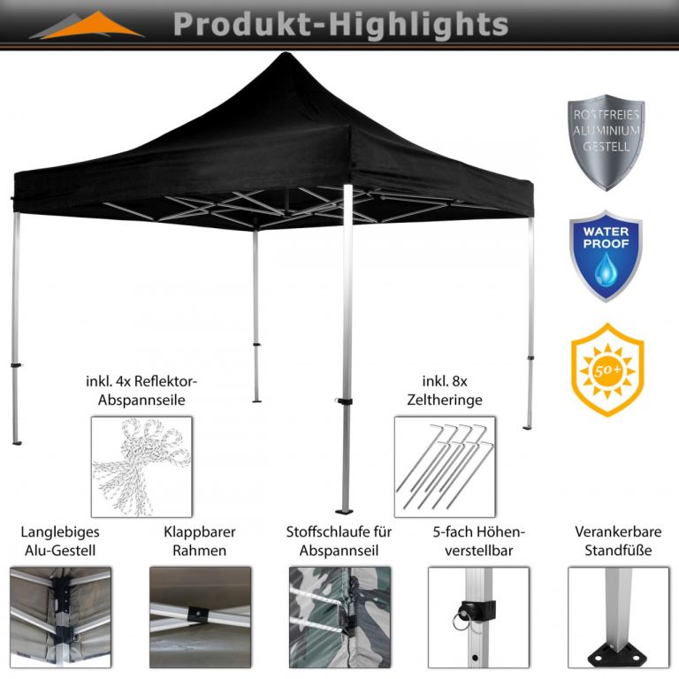 Az összecsukható sátor kiváló minőségű. A sátor 100%-ban működőképes. Vízálló, és a speciálisan impregnált tetőfedésnek köszönhetően az UV napfény 98%-át blokkolja. A rozsdamentes acél keret védelmet nyújt a karcolások és a korrózió ellen. A további stabilitás és tartás érdekében a konstrukció megnövelt lábai, extrastabil összekötő anyag és kiváló minőségű kattintható rendszer található, külső csavarral, feszítőgyűrűvel. A tető megtámasztására egy integrált központi feszítőoszlop található.