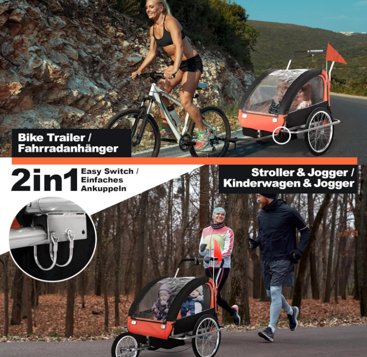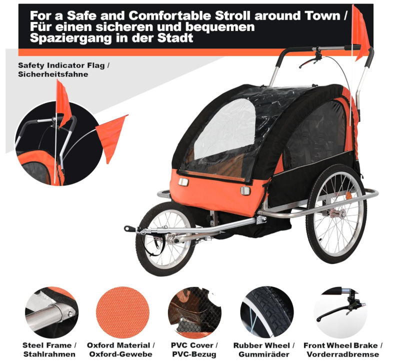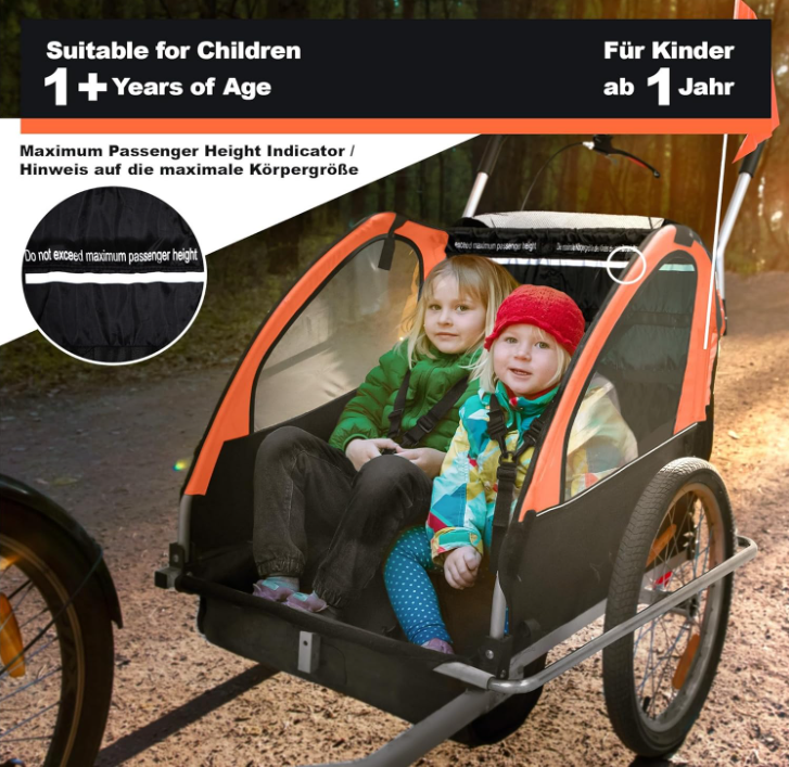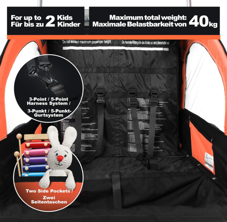 Bemutatjuk gyermek kerékpár utánfutónkat ez a kerékpár utánfutó 10 mm-es középső tengellyel rendelkezik, és elegendő helyet kínál két, akár 40 kg összsúlyú gyermek számára. Babakocsiként is használható, így nagyszerű választás városi családok számára, mind funkcionalitása, mind a kétgyermekes könnyű városi séták miatt. A babakocsi két 5 pontos biztonsági övvel, elöl és hátul fényvisszaverő csíkokkal, első kerékfékkel és zászlóval van felszerelve. Kerékpár utánfutónk könnyen átalakítható babakocsivá, ami sokkal könnyebbé teszi a mindennapi városi közlekedést, és sok helyet takarít meg a tárolóhelyen. Ez a gyermek utánfutó bárhol használható - vidd el gyermekedet iskolába vagy óvodába, vidd magaddal a heti bevásárlást, vagy használd babakocsiként játszótereken és parkokban. A gumiabroncsokat 20-50 PSI nyomásra kell felfújni kézi vagy lábpumpával (a nyomótömlő túlfújást okozhat).