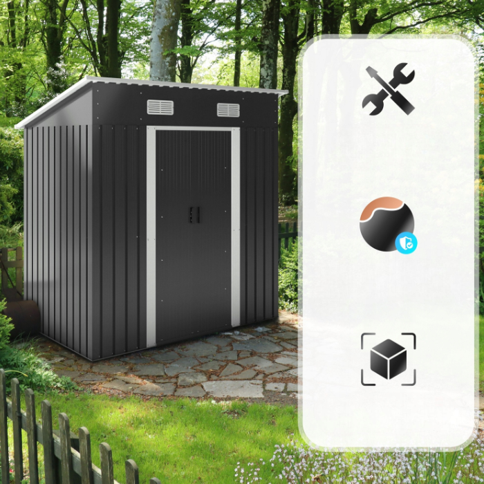 Üdvözöljük kerti paradicsomunkban! Bemutatjuk a lenyűgöző Jago® kerti fészert, az Ön megbízható partnerét a tökéletesen szervezett kertért! Ez a kerti fészer több, mint egy praktikus menedék kerti szerszámai és háztartási eszközei számára. Stílusos ékszer, amely ellenállhatatlan bájt kölcsönöz kertjének. Kompakt méreteivel, amelyek nem befolyásolják kertje összképét, mégis elegendő helyet biztosít az összes szerszáma tárolására. A praktikus ónozott acél felületnek és az időjárásállóságnak köszönhetően ez a kerti fészer bármilyen kihívással megbirkózik, amit az időjárás hoz magával. Felejtse el a rozsdásodás és a karbantartás okozta aggodalmakat! UV-állósága megvédi a fakulástól, és biztosítja, hogy értékes szerszámai tökéletes állapotban maradjanak. A fészer ajtajai tolóajtók, ami könnyű hozzáférést biztosít és maximalizálja a belső teret. Ezenkívül négy szellőzőrács garantálja az optimális légáramlást, ami kulcsfontosságú a szerszámok tökéletes állapotának megőrzéséhez. A kerti fészer összeszerelése gyors és egyszerű. Világos utasításokkal és egy második személy segítségével 2-3 óra alatt megépítheti. Biztos lehet benne, hogy sikerrel jár!