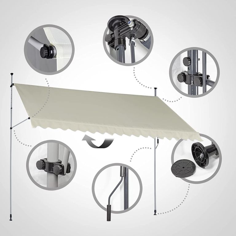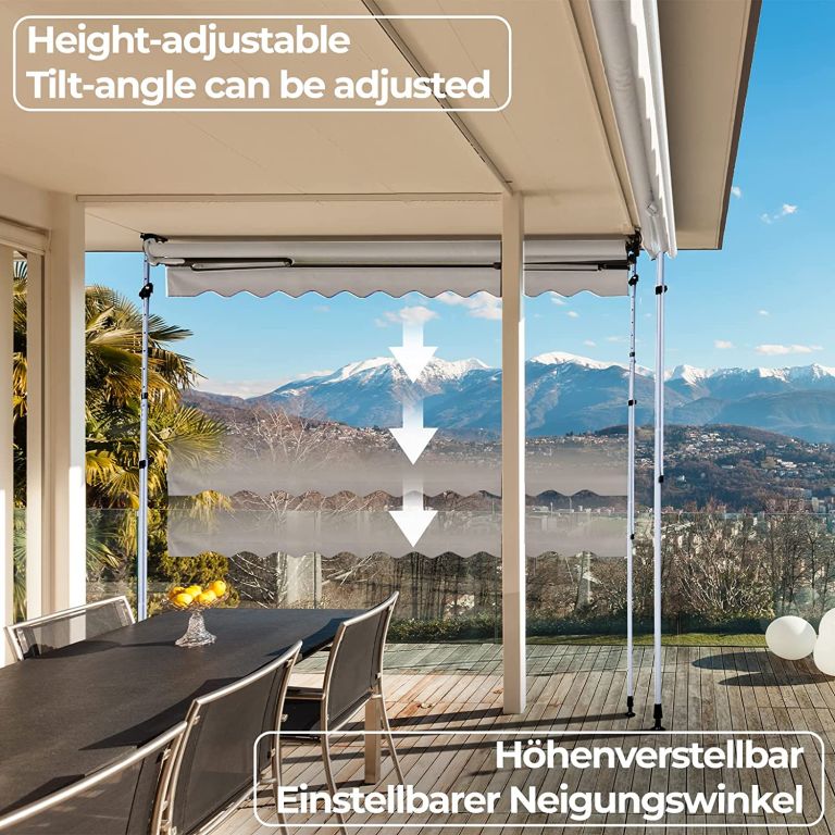 Az erkély napellenző teljesen vízálló poliészterből készült, poliuretán réteggel, integrált UV védelemmel. A napellenző magassága 2 és 3 m között állítható, így a napellenzőt szobája igényeihez igazíthatja. A kézi működtetésű terasz napellenző a dőlésszöget szabályozó teleszkópos rúd kézi fogantyújának köszönhetően egyedileg állítható. A praktikus rögzítésnek köszönhetően a befogó napellenző pillanatok alatt használatra kész, anélkül, hogy szükségtelen beavatkozásra lenne szükség a helyiségben.
